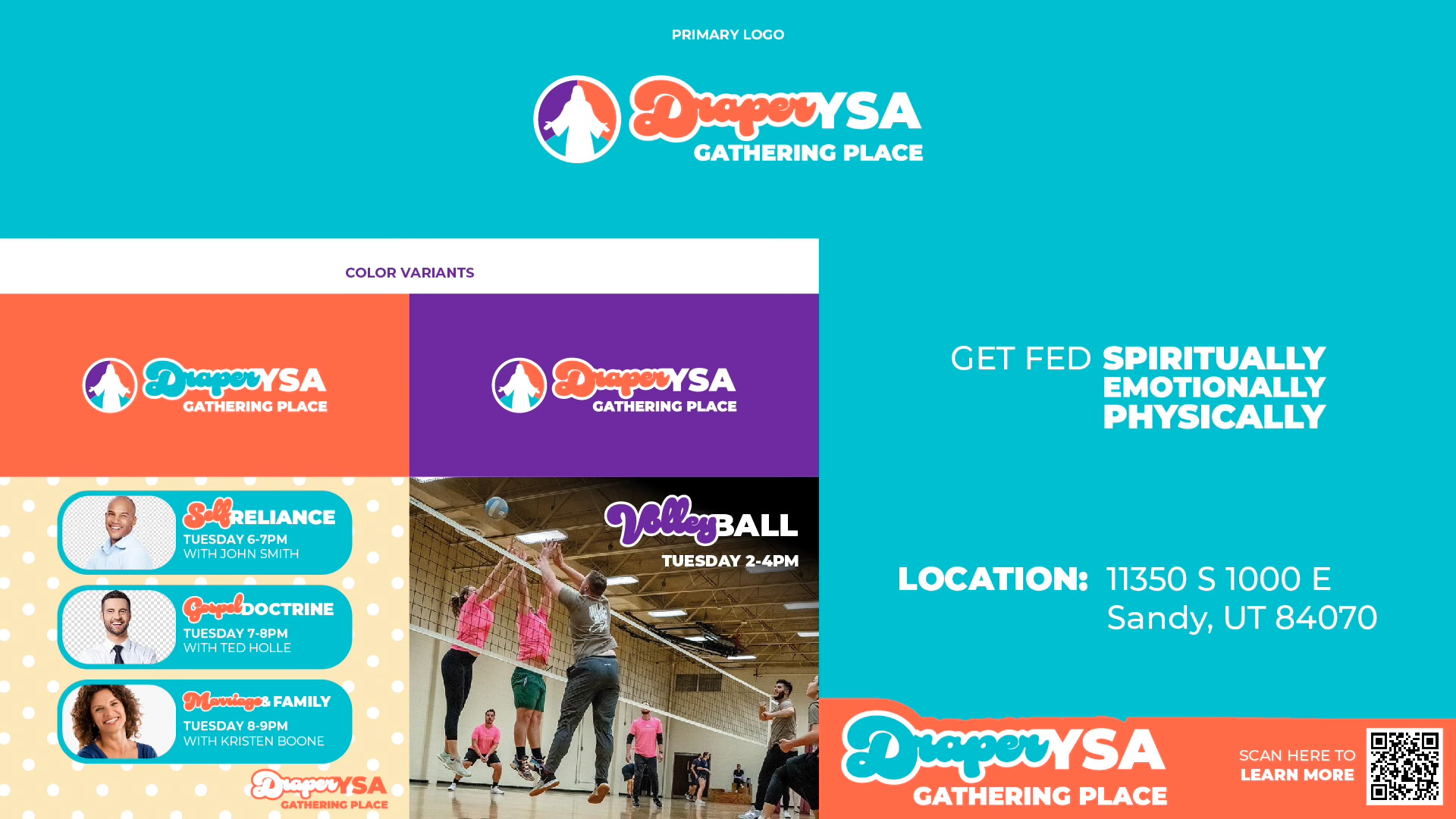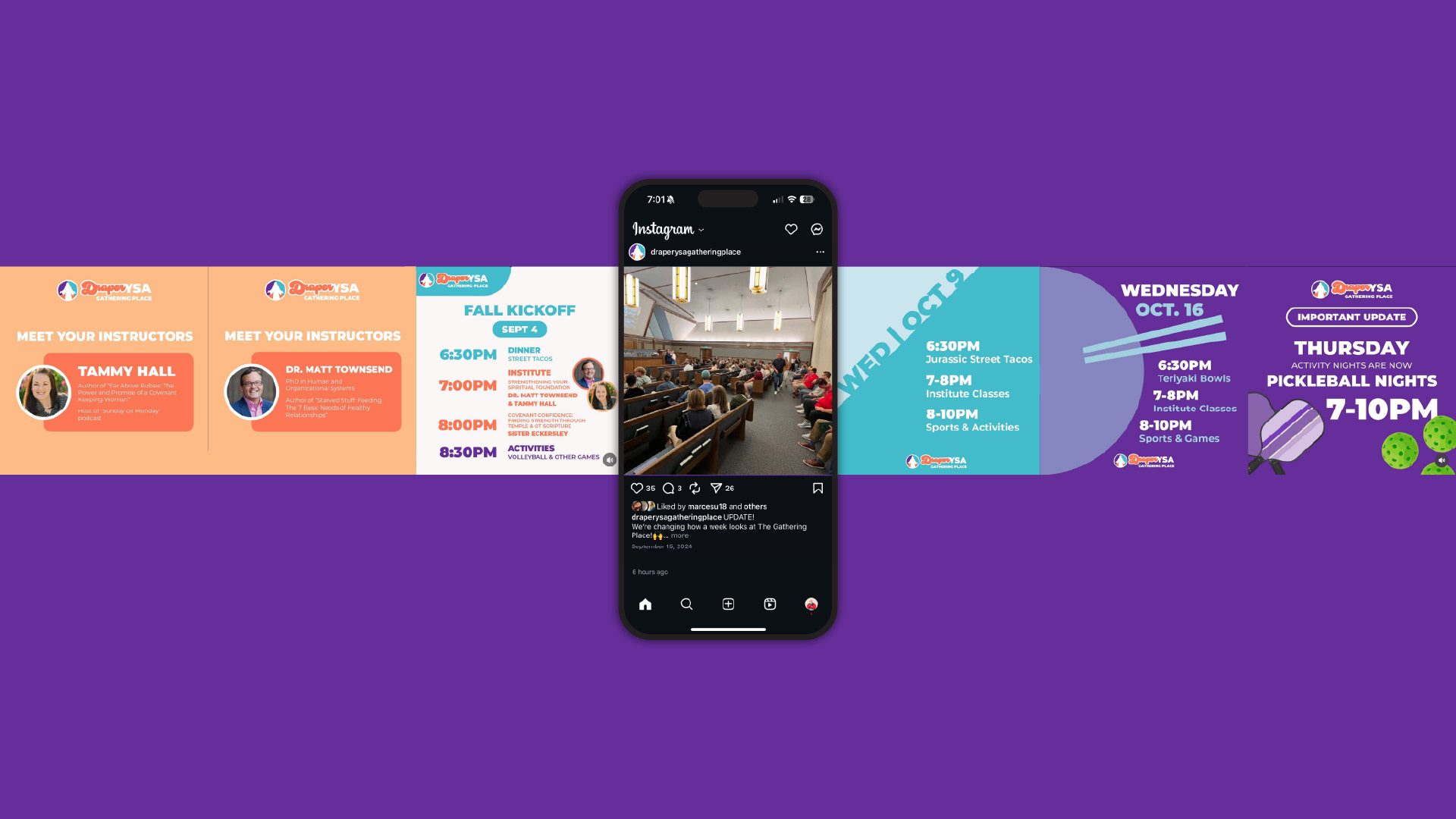 I was asked early on in the development of the Draper, Utah Gathering Place to join the team. I was responsible for developing the brand, designing handouts, posters, and banners. After we got it all set up, I was asked to create and manage the Gathering Place's Instagram.
